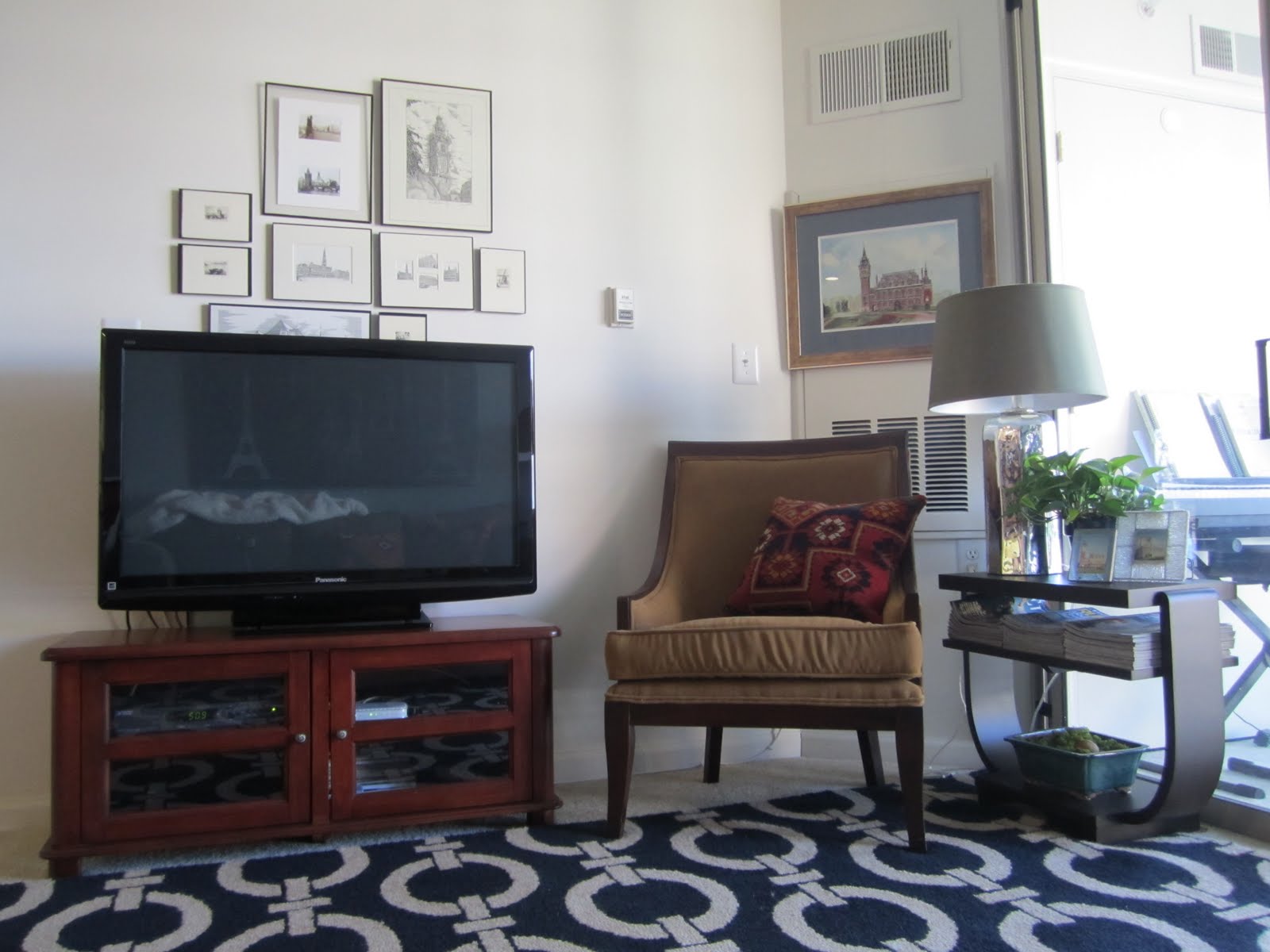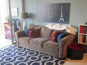 Living Room. The dining room and library flow into the living room, which is demarcated principally by a giant rug — which, by the way, is bigger than my car. You should have seen me driving home with it from the store. I looked like one of those tropical leaf-cutter ants. (I had the same problem with the television… it’s what happens when you drive a Kia.) Anyway, the most important thing is that you can see the Eiffel Tower. As we know from the movies, one should always be able to see the Eiffel Tower.