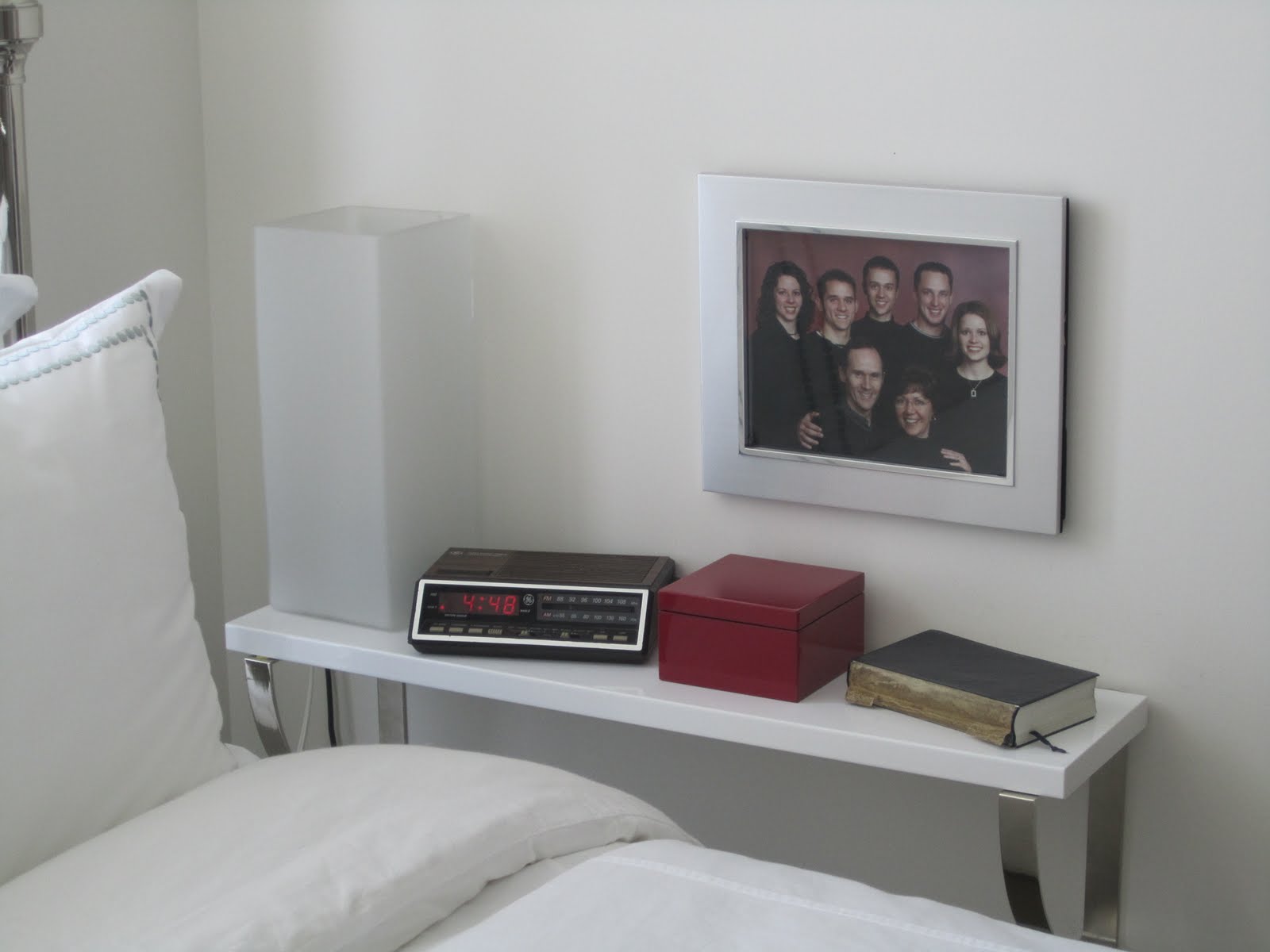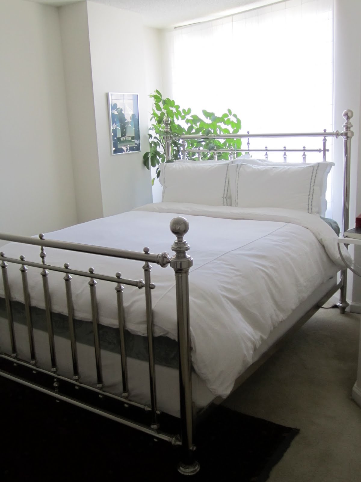 Bedroom. The bedroom opens just off the dining/living room. I wanted it to be a clean, stress-free place where I could sleep without worrying about clutter or anything else. I also had the great idea of using a shelf instead of a bedside table (which, I’m happy to say, I came up with all on my own – before watching an interior decorating show that suggested doing just that). The plant in the corner is lovely but, alas, I think it’s days are numbered — it appears recently to have come down with the plant version of leprosy.