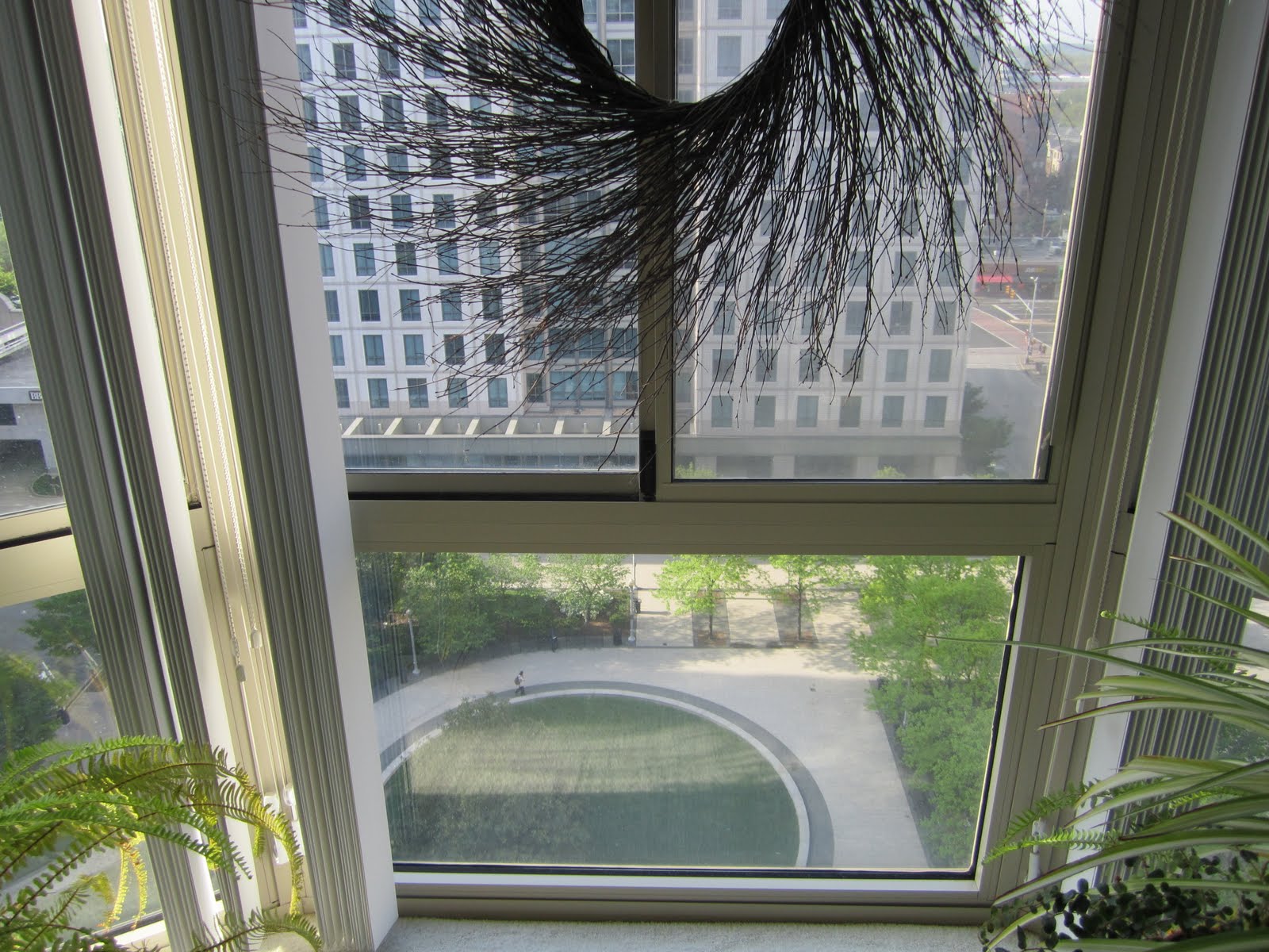 Sun Room/Office. Back to the living room and out to the best feature of the apartment: the sun room. This is the whole reason I moved into this apartment. Perched on the thirteenth floor and overlooking a park, this north-facing, glass-enclosed room has served as my office. As long as I was going to have to work long hours from home, I wanted to do it in place that felt as free and open as possible. (It also let me try my hand at growing giant ferns — that’s a tale of woe for another day…) The wreath is from Maine and is made of birch branches.
