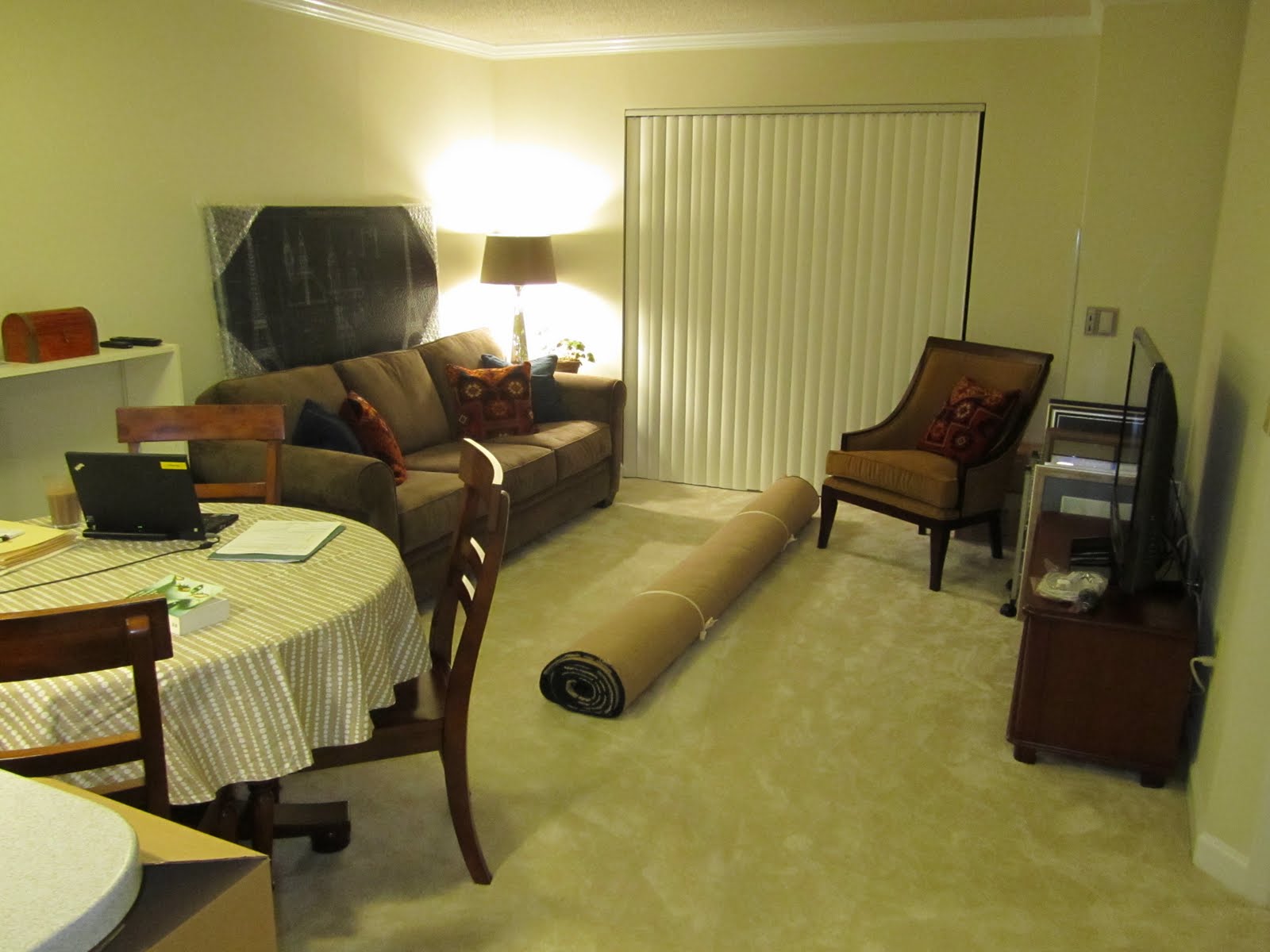 I got up early on Saturday and set about finishing the remaining tasks that needed to be done before the movers arrived at 3pm. I bought some more boxes from UPS, dismantled the dining room table and desk, cleaned the bathroom and kitchen, vacuumed everywhere. Then I went over and checked into my new place, which was all pristine and ready to go: