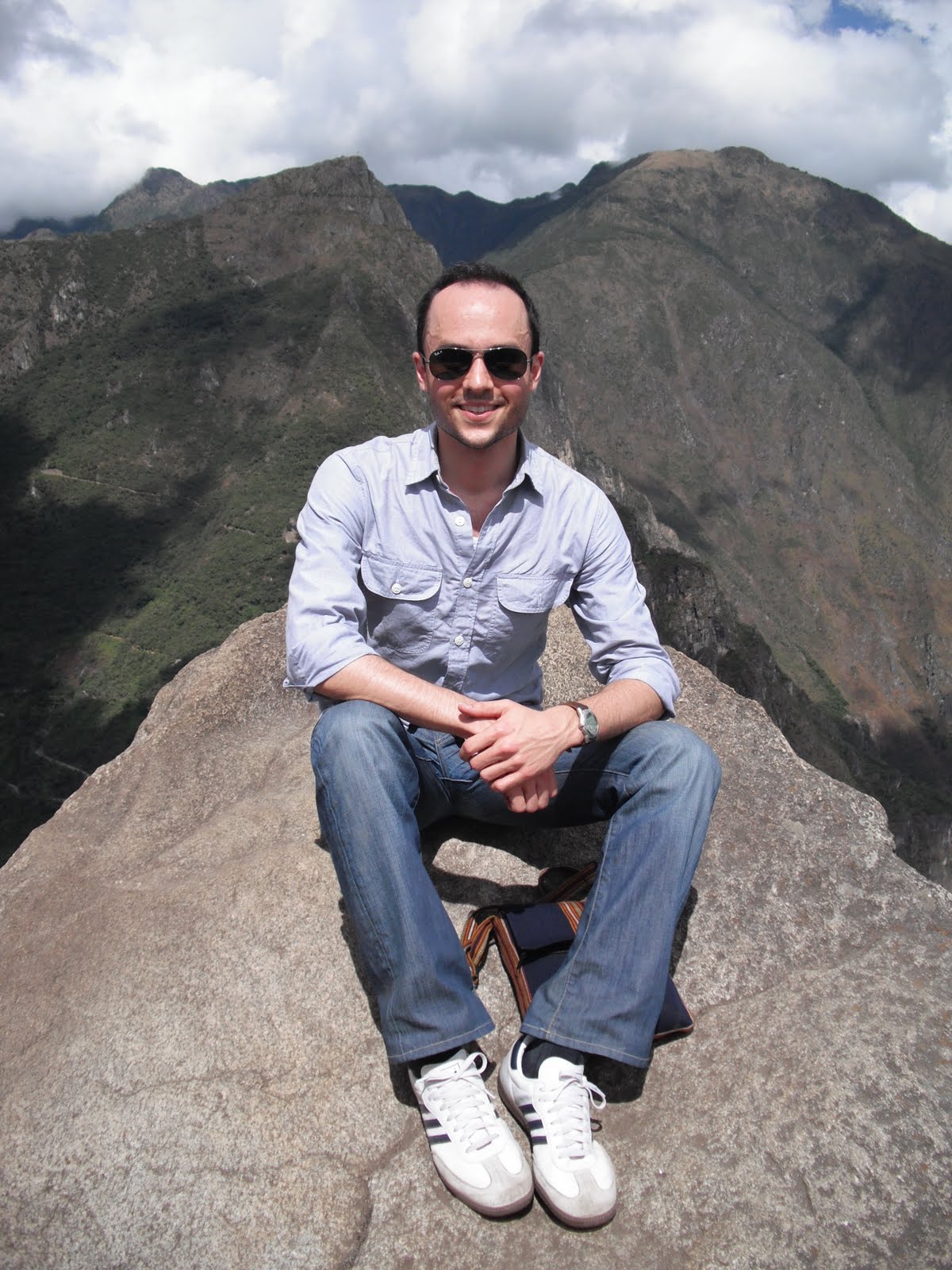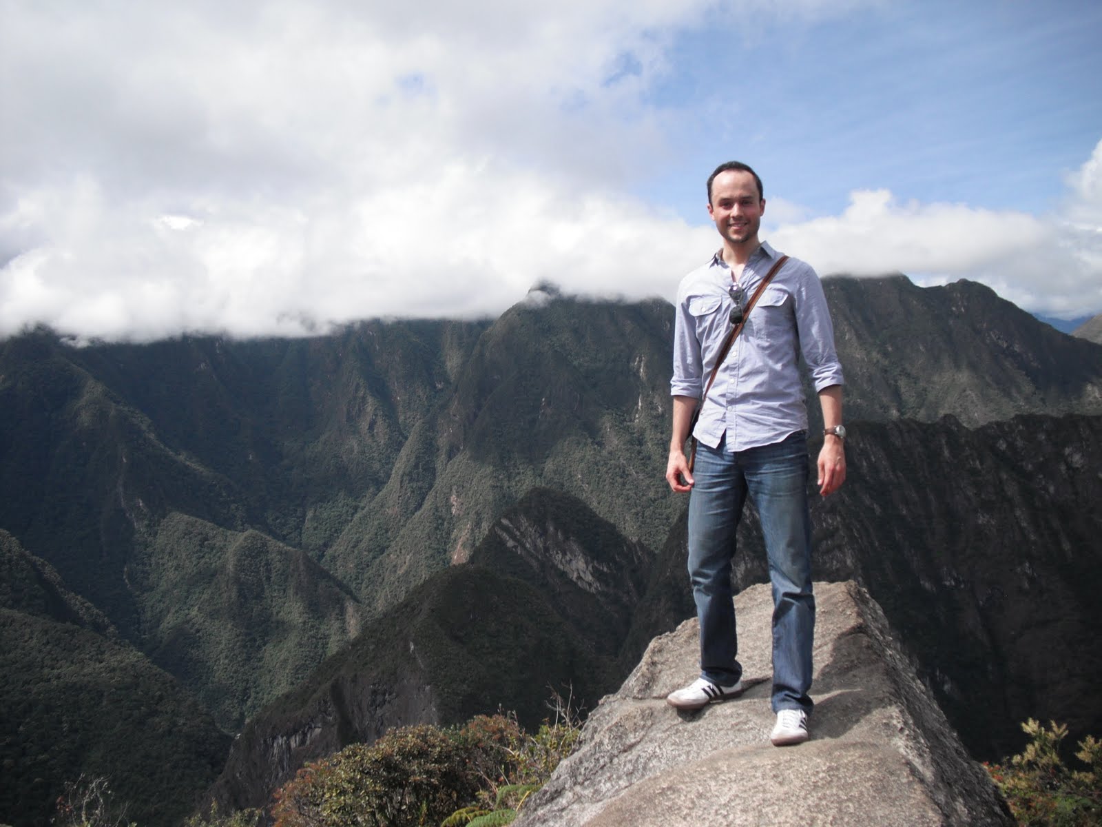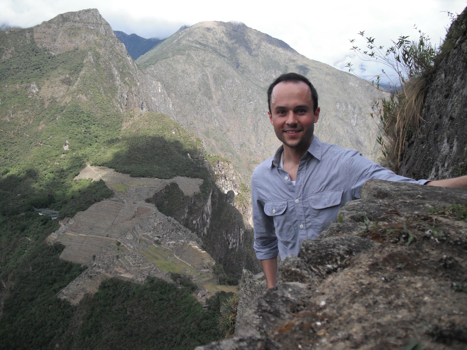 | Almost at the top, with Machu Picchu in the background (my sunglasses are off because I was sweating so much they kept running off my face) |