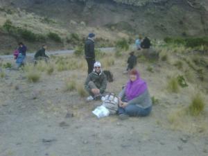 That’s right: Amanda and me and our eight fellow travelers are sitting on the side of the road like so many refugees. Watching a storm blow darkly across the valley, right in our direction. (Which makes me wonder: If it turns into a snow storm and we don’t get rescued, could I survive by sleelping inside a dead llama, like Luke Skywalker did with that Ton-Ton? I’d rather do that than pull a Donner Party and eat the Japanese lady.)
