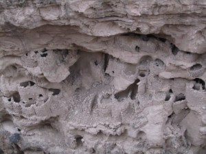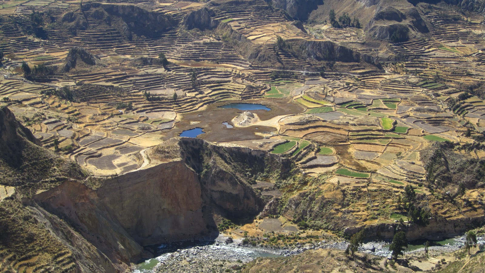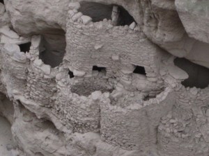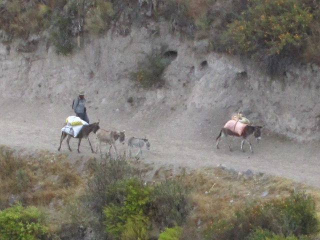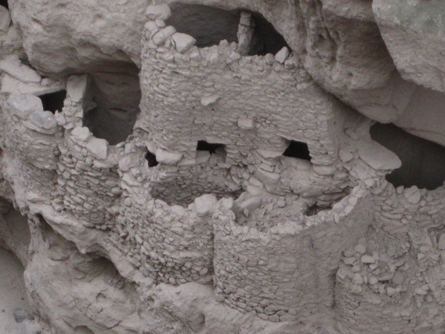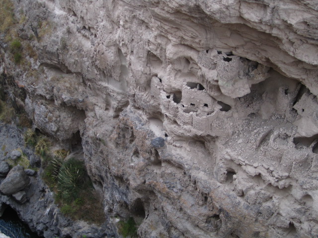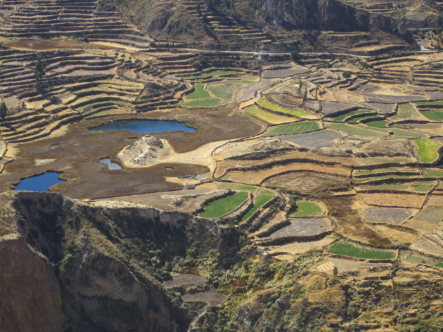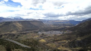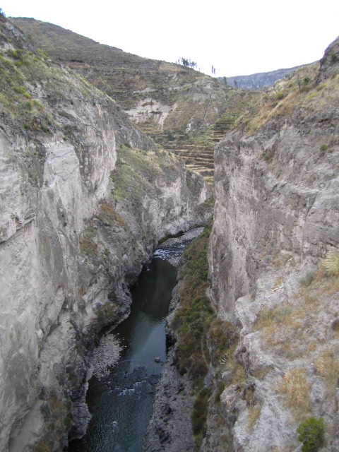 The ancient people who lived in the Colca Valley constructed storehouses in the cavities of the many cliffs in the valley. These storehouses were used for food and other perishable items that the people needed either for trading purposes or for their own survival during lean times. These storehouses are called “colcas”, hence the name of the Colca Valley and Colca Canyon. The colcas we saw were built into a cliff above the river; we viewed them from a bridge. I was struck by how the colcas resembled the Native American cliff-dwellings in the Western United States, such as Mesa Verde. (The people constructed similar structures as tombs elsewhere in the valley, but those technically are not colcas.)