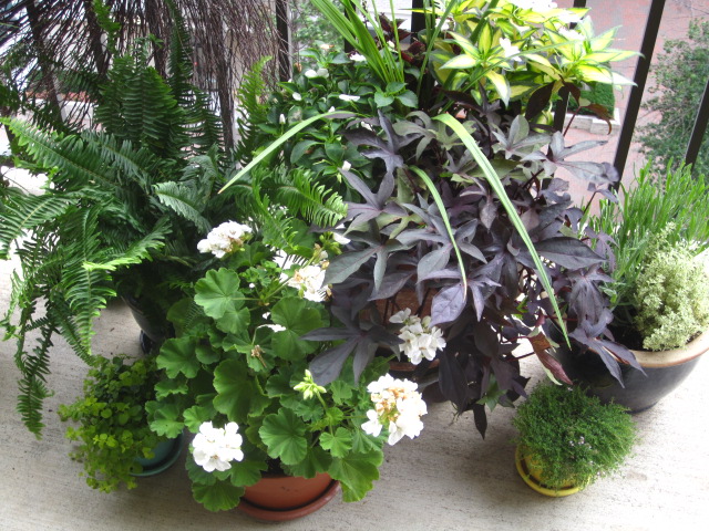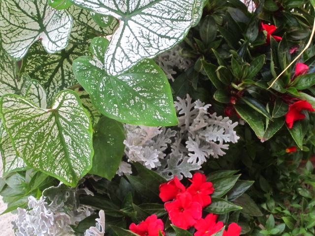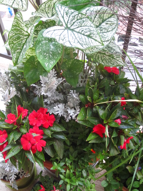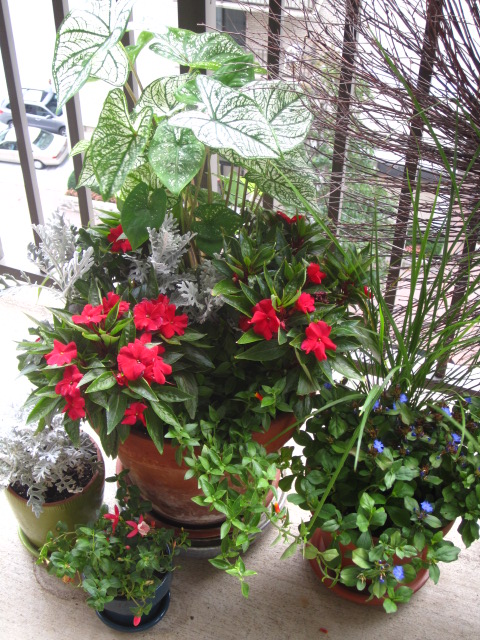 | Big pot (from top): caladium, dusty miller, new guinea impatiens, candy corn vine Small pots (from left): dusty miller, fuschia, [blue flower I forgot the name of] |