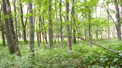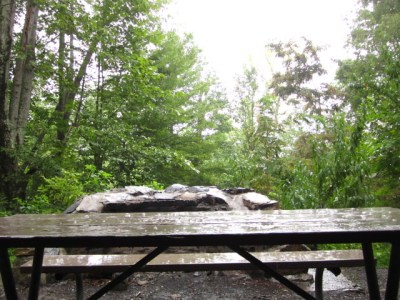 Along the way, we saw lots of trees. To be honest, we saw too many trees. The bulk of the trail ran along the tops of ridges and over the peak of a little mountain, but you’d never have known it, because the entire time we were enveloped in a lush forest that effectively blocked out any views we might have had. Every once in a while, things would open up and we’d catch a hazy glimpse of the valleys below, but most of the time it was just tunnels of green. As much fun as it would be, in concept, to hike the length of the Appalachian Trail, I think this lack of views would be a mighty monotonous hike. Monotonous, though, is not the same as ugly. Much of the forest we saw was very lovely, with light filtering through the lacy leaves and onto the carpet of ferns below.