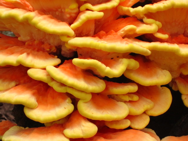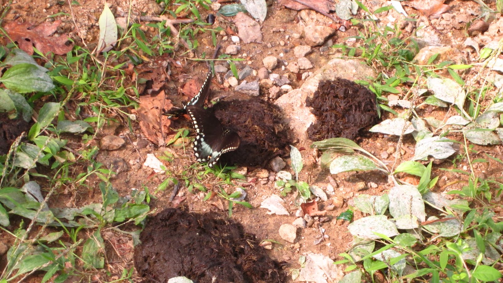 Without sweeping vistas to distract us, we were able to notice the smaller-scale beauty that surrounded us. We discovered some startlingly orange fungus. Also some butterflies eating dung. And those invisible spider-webs that are so unpleasant to walk through? Well, they look pretty cool when the sun catches them just right.