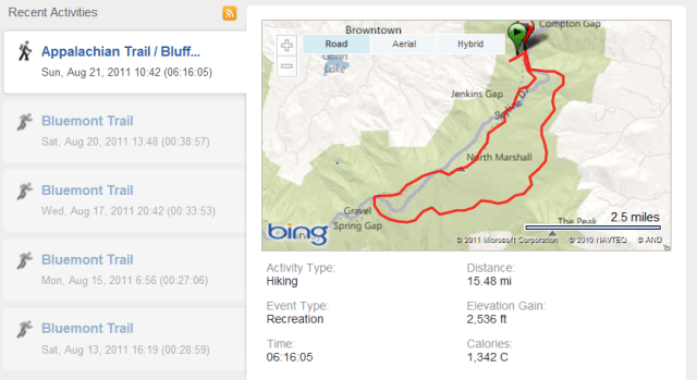 We planned to hike an approximately 14 mile circuit — half of it going south, along the famous Appalachian Trail, and the other half going north, along the Bluff Trail, which doubled back on the other side of the ridge we’d come down on. Having misunderstood our initial directions, we ended up taking an early detour that pulled us about a mile out of our way, so by the time we finished we’d done about 15.5 miles.