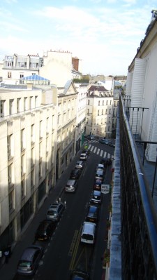 And now we’re here! We’ve got a room at the Grand Hotel des Balcons in the Saint Germain neighborhood, right next to the Odeon Theatre. The room is on the fifth floor (with an elevator that fits 1.5 people at a time) — it’s tiny, but clean and definitely sufficient for our needs.