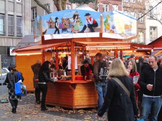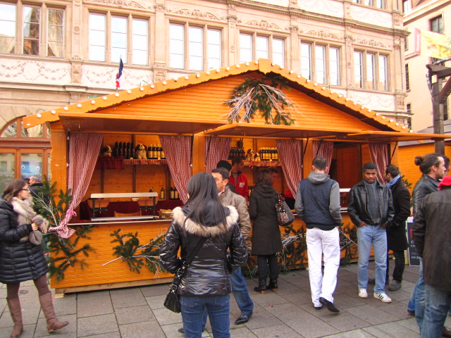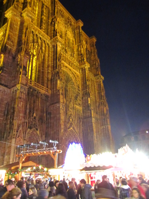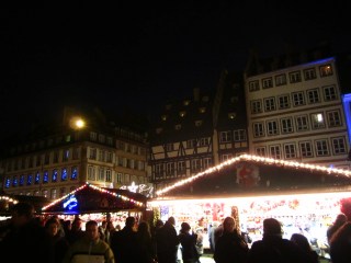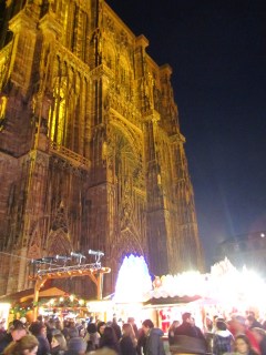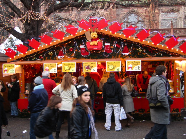 When I was in Strasbourg at Christmastime in 2000, I fell in love with its marché de noel. Clustered in little chalet-style huts at the foot of the cathedral, you could get all sorts of wonderful crafts and decorations. I particularly liked the Russian Santa Clauses and the German smoking Santa Clauses (at least one of which is standing on Lady’s shelf right now). Amanda, too, had fond memories of similar markets in the German towns where she lived as a child. The primary reason for making this trip to Strasbourg was to go to the marché and do some serious Christmas shopping.