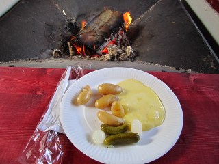 | Raclette cheese with potatoes and cornichons (and a fireplace!) |