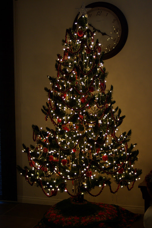 This is the tree on which Lady honed her lighting technique: two strings (200 lights) for every foot of tree; one light on the very top.