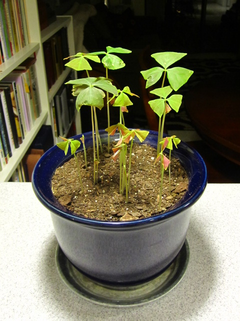 After a month of alarmingly quiet resting beneath barren dirt, the shamrock has sent up a slew of fresh stalks with delicate new leaves.  Though still few in number, these new starts are vigorous and healthy — and I drench them daily with poison to ward off the wee beasties that brought her to death’s door last fall