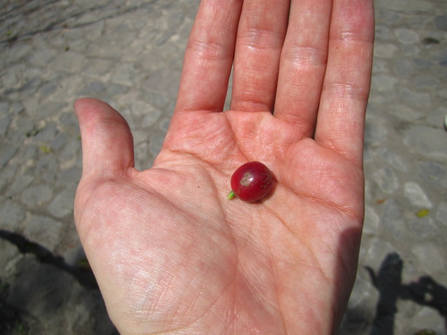 The coffee beans grow in little fruits that look like cranberries. They form in clumps along the branches and turn red as they ripen. Strangely, the Arabica berries ripen at all different times, so at any given moment you can have flowers, green berries, and ripe ones all on the same branch. Makes for a tedious and prolonged harvesting process because each berry has to be picked one at a time, by hand, and each bush has to be harvested multiple times to get all the berries.
