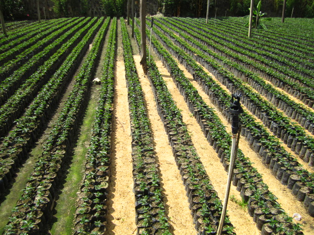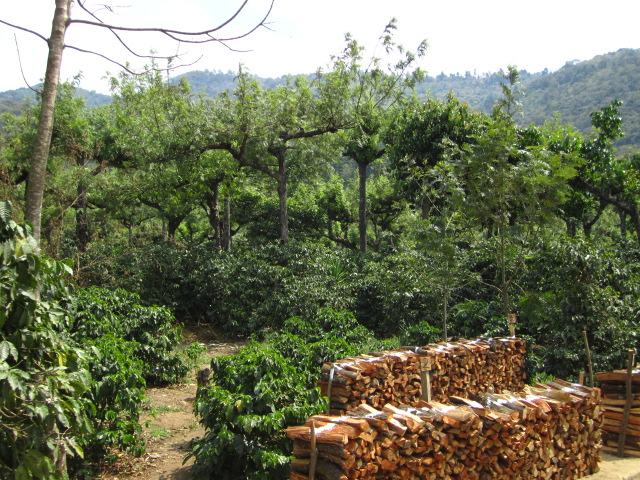 | The lower bushes are the coffee plants, the trees are there for shade and to attract pest-eating birds |