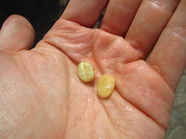 If you pull away the red fruit, you find a slimy little kernel that looks more like what you’d expect a coffee bean to look like.