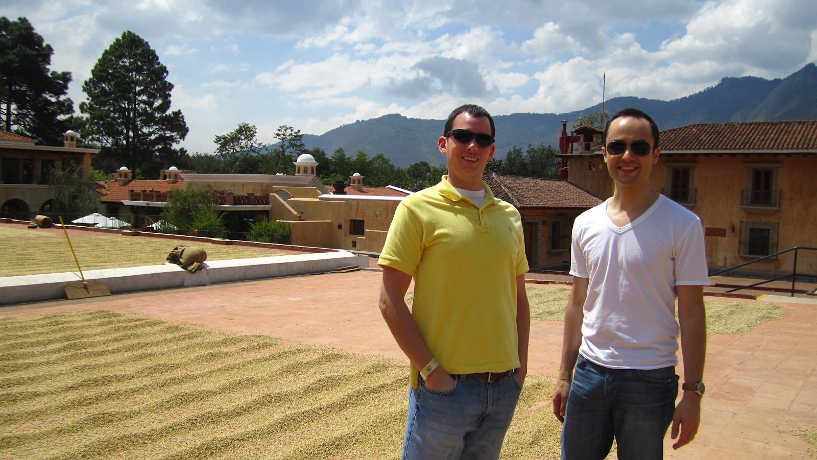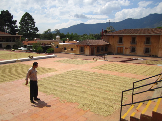 | Patios where the beans are dried in the sun before being run through machines to remove the husks |