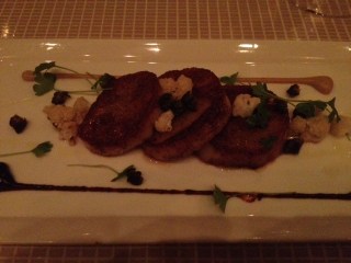 I started with sautéed sea scallops with golden raisin purée, cauliflower beignets and crispy capers.