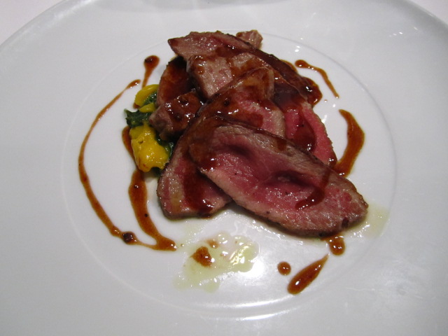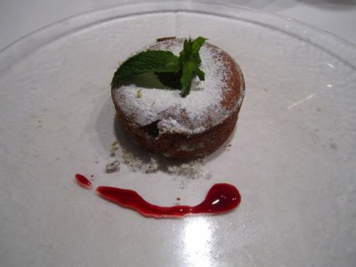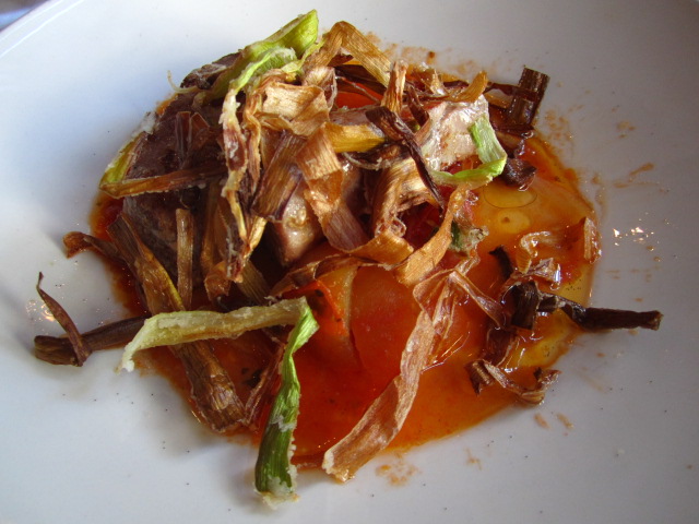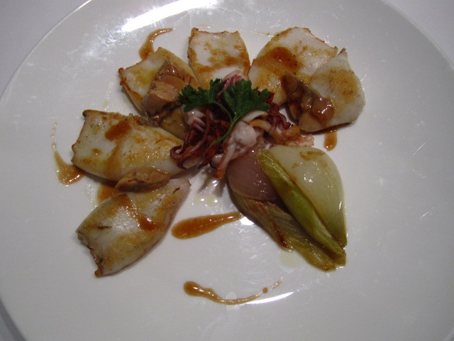 The ordering process was particularly amusing. The chef came out and introduced himself. We discovered that he didn’t understand a word of our English and that I couldn’t understand a word of his Spanish (or whatever language he was speaking). He started off by describing the fresh fish options for the day and then beaming expectantly at me while I translated for Amanda. I turned to her and said, “I didn’t understand any of that, so I hope you weren’t planning to order fish.” (I also said a few more things, so that the “translation” was roughly as long as the original description; I added some hand gestures to make it more convincing.) When the chef returned a few minutes later to take our order, we realized that while English-language menus were helpful in making our selection, they were of no use in ordering. I had no idea how to say “grilled squids with duck liver” or “Iberian steak with spinach and mango” in Spanish, and the chef certainly didn’t have a clue what we were talkinga bout. So we had to get out the Spanish menu and point to the corresponding line of text, hoping that the menu items were listed in the same order in each language (they were).
