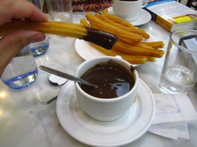 The Chocolateria San Gines sits in a tiny alleyway just off the Plaza Mayor. Every guidebook we brought (and we brought several) said it was a must-do for chocolate lovers, so we stopped by after our visit to the plaza. The chocolate was indeed tasty, very dark and thick; almost like pudding. The churros, too, were good (they reminded me of being a kid at the state fair and just wishing — WISHING — that my parents would buy me some churros) but we ended up with twelve of them, which was a tad much. We downed as many as we could and then headed back out to the streets.