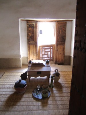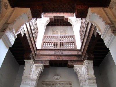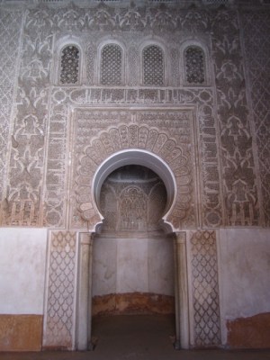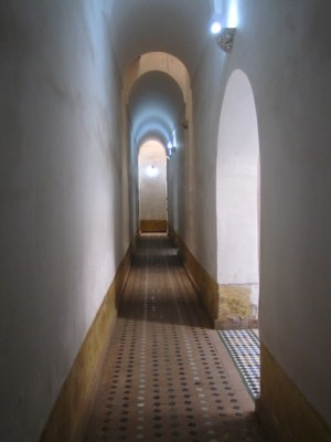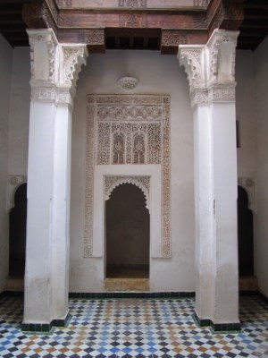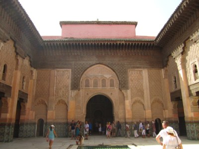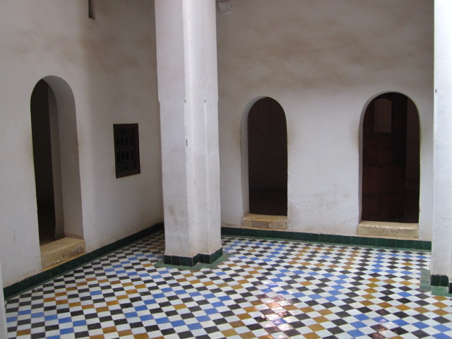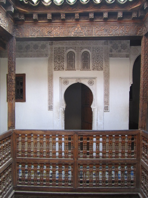 The Ali ben Youssef Medersa was built in the 1560s as a school for Quranic learning. The complex of buildings served primarily as a residence hall for the students, since the courses were all taught in the adjoining mosque. It provides some exquisite examples of the architectural and decorative elements we saw yesterday at the 19th century Bahia Palace.