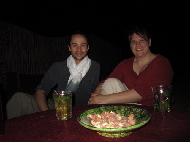 After dinner Said and the two other Berbers (whose names I never learned — they stand out in my mind for their remarkably pungent personal odors and proclivity for repeating the word “Africa” at regular intervals with the expectation that those who hear respond with “Wakaka”) brought out drums and hand cymbals and treated us to some fun and entertaining African songs. Most of them weren’t Moroccan — I think the majority were from Senegal. A couple of times they paused and invited us to share some American music. I thought of several Boy Scout camp songs, but they all required some sort of call and response — Amanda didn’t know them and it would have taken too long to teach the Berbers the words. When we saw that we weren’t going to be able to avoid contributing something, we settled on one round of “Row Row Row Your Boat” — which was such a complete flop that we weren’t asked to sing again (although we were expected to try our hand at the drums and at dancing).