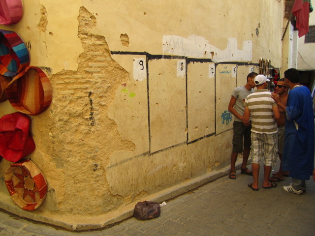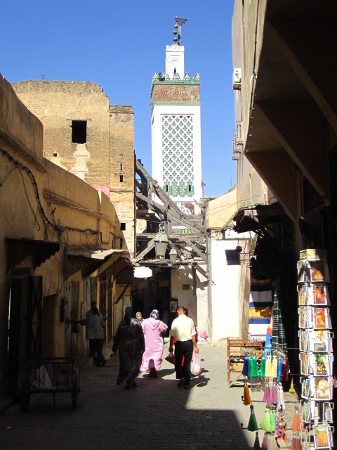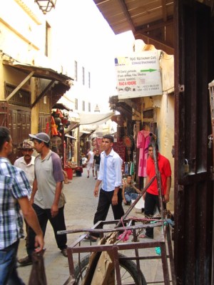 In the spirit of giving Fez a second chance, we set out on a walking tour of the Fez medina after returning from Volubilis. We still were struck by how different it looked and felt from the souqs in Marrakesh, but the longer we walked the more it grew on me. The whiteness of the city is lovely, and the bewilderingly chaotic energy is contagious. Well, it’s off-putting at first, because there are no street signs and it’s easy to feel lost in the maze. But once you power up the Blackberry GPS and start tracking your location to within a meter of where you’re actually standing, you start to feel like you know where you’re going (and like you aren’t going to get lost forever).