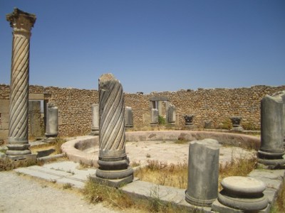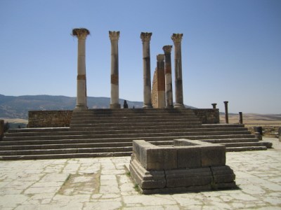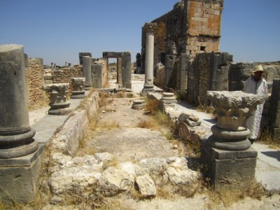 By the second century BC, the Roman empire extended through a network of fishing cities in northern Africa. During the last century BC, they established themselves in Volubilis, not far from current-day Fez. The city remained under Roman control until the Berbers drove them out in the 300s AD. The Arabs took over in the 8th century AD and remained until the place was leveled in the 1755 Lisbon earthquake. Today, it’s a city in ruins set among fields and olive orchards. We hired a driver to take us out to visit it. We’ve seen Roman ruins before, and in general these ruins didn’t stand out as particularly remarkable. But the mosaics were incredible — some of the best I’ve seen. Plus, everything was Roman and therefore familiar; it felt kind of like coming home and seeing all your old friends.