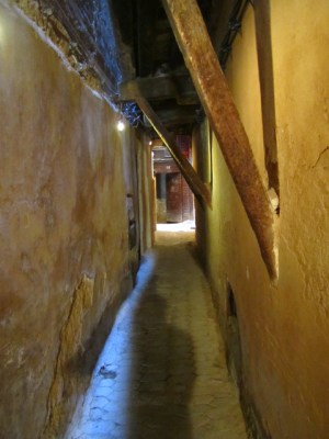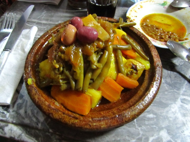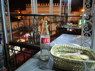 Dinner at La Kasbah. Although recommended by our riad and the guidebooks, this restaurant is the weakest we’ve seen since that awful “authentic Moroccan” place we went to in Marrakesh. The food was mediocre and the presentation subpar. In fact, I’m pretty sure they didn’t even cook my “tagine” in a tagine — whereas every other tagine I’ve ordered comes boiling in the dish, the meat and vegetables in this one had quite obviously been spooned onto a cold tagine dish just moments before being served. On the other hand, it was nice to sit on the roof-top terrace with views over the place below.