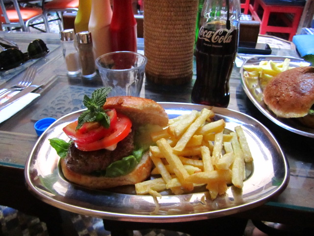 Lunch at Cafe Clock. We picked this British-owned place because it was recommended in all of our guides, and because we wanted a break from traditional Moroccan fare. Finding it was a trick, since the entrance is down a long, narrow crevice in the walls of the souq. But the lamb burger with mint was tasty and very satisfying.