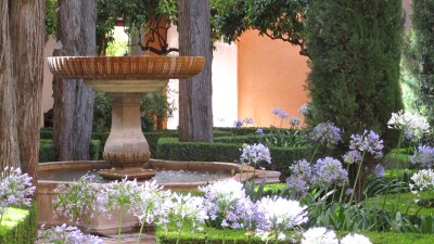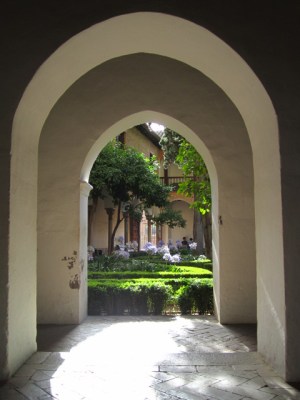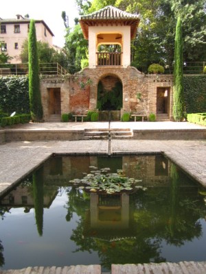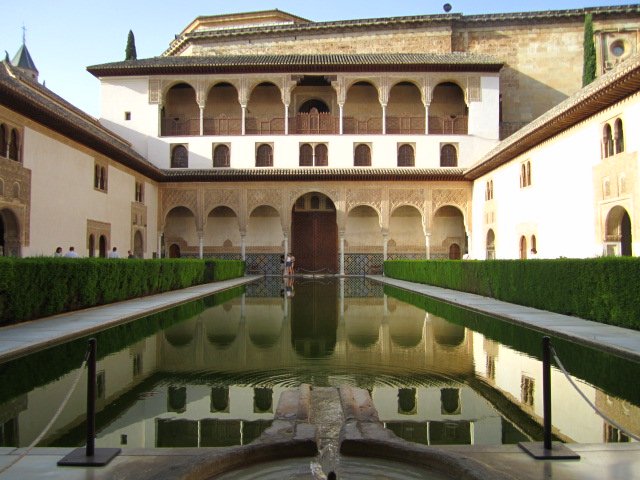Amanda and I had read about the Alhambra’s famous beauty and designed the whole post-Morocco portion of our trip around visiting it — hence the importance of our getting from Morocco to Granada as planned. Fortunately, we did get there as planned (albeit very short on sleep), and we were not disappointed. The Nasrid palace and gardens, and the gardens of the Generalife, easily count among the most beautiful man-made places I have ever visited. The sensory pleasure is exquisite: Graceful buildings are reflected in still pools surrounded by myrtle hedges; sunlight streams through latticed windows into shadowy rooms with roofs like the starry night sky; plaster work of infinite detail praises God and beautifies every wall; fountains and rivulets fill the space with the burbling sound of water; the scent of lavender, thyme and jasmine hangs heavy in the air.