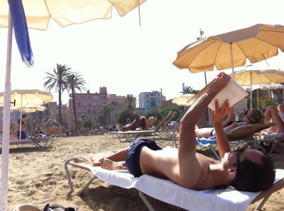 Beach day today! We took our time in the morning, had a leisurely breakfast and then took the metro to the Barceloneta beach. By 11am we had rented an umbrella and a pair of lawn chairs from an African man in a Mets hat and were set for the day. The weather was perfect (mid-80s with a light breeze and no clouds), the water refreshing, and reading material plentiful. Except for periodic dips in the sea and a short run to a nearby grocery store for some baguettes and ham, we didn’t move from that spot until just before 6pm, when it was time to get ready for the concert later. After two weeks of active, intense traveling, it was glorious to just relax and do nothing but lie in the sun for a day. What a great way to finish this vacation!