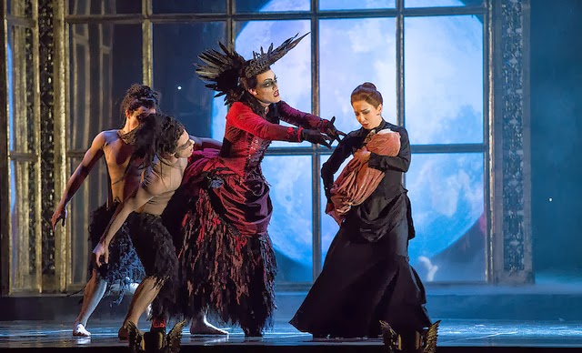 Then, inevitably, the evil fairy, Carabosse, arrives to place her curse on the baby in retribution for the parents’ failure to thank her for helping them conceive in the first place. What I loved about this scene was the depiction of Carabosse’s dark prophecy. The baby was spirited away and, in its place, appeared the adult woman dancer — only she was faceless: a flesh-colored mask eliminated all features, to very creepy effect.