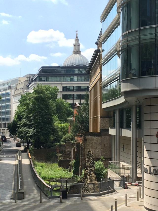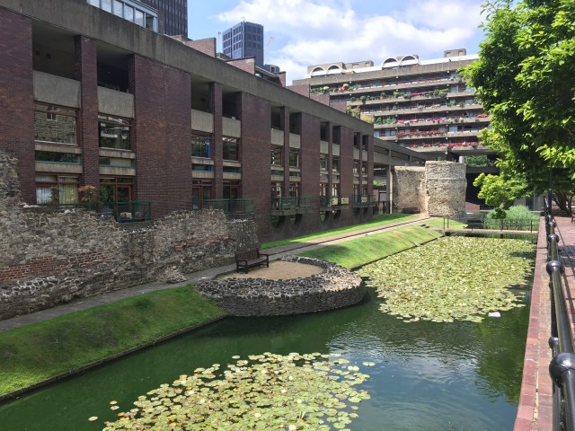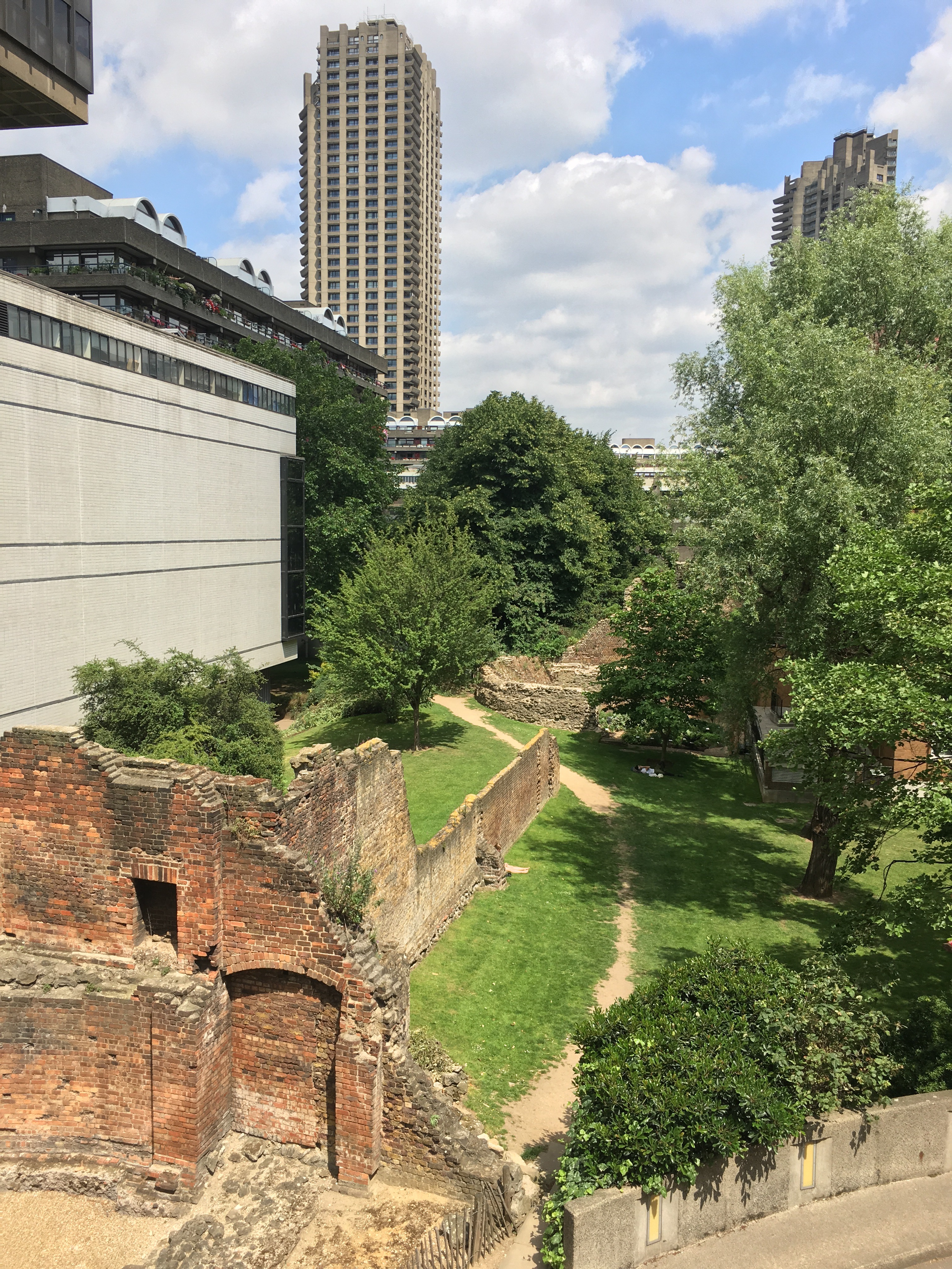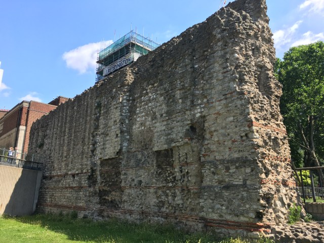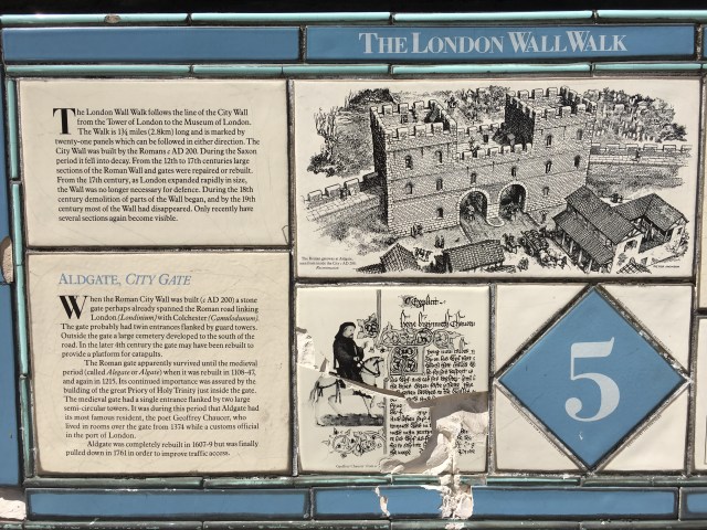 There’s an official London Wall Walk that essentially consists of series of panels that mark where the old city walls used to stand (or even in some cases still do stand).  They start at the Tower of London (built in the 1060s after the Norman Conquest) and curve up and around to a complex called the Barbican, which stands on the site of the Roman fort.