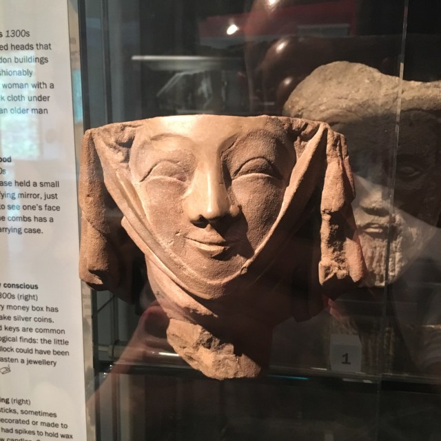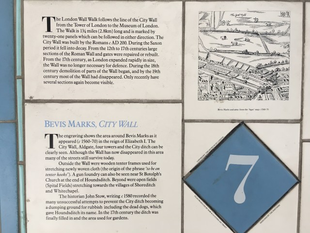 This is my favorite thing about the wall walk panels — they show maps from the Elizabethan era for the areas that I walk through every day.  Also, you learn interesting things — for example, the modern Houndsditch Street (where my gym is located) is built on the old city ditch that ran just outside the old city wall (pictured above).  It got its name from being a ditch where people would dump dead dogs!