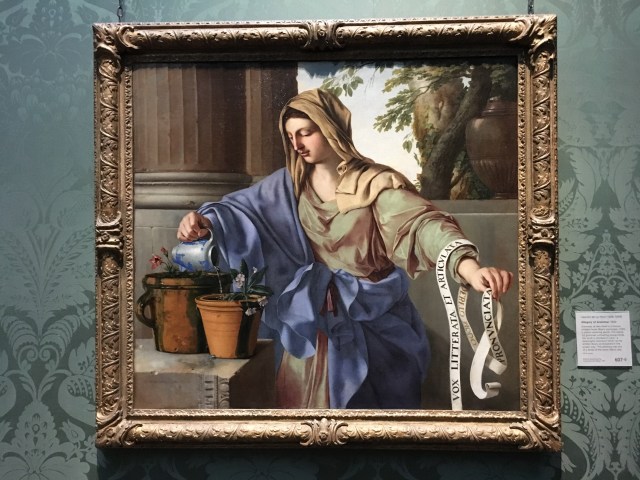 I also like seeing evidence of humanity and the artist’s observations come through in the more mythical paintings. In this one, for example, the woman isn’t all that interesting to me–just a idealized beauty–but the guy looks so specific I can imagine the real person sitting there as a model. And my favorite part is the cupid’s face. It’s hard to see in the photo, but the expression looks exactly like the expressions I’ve seen on my nieces and nephews when they were looking intently at something and trying to figure it out. You know the artist had spent time with a baby to get that look right.