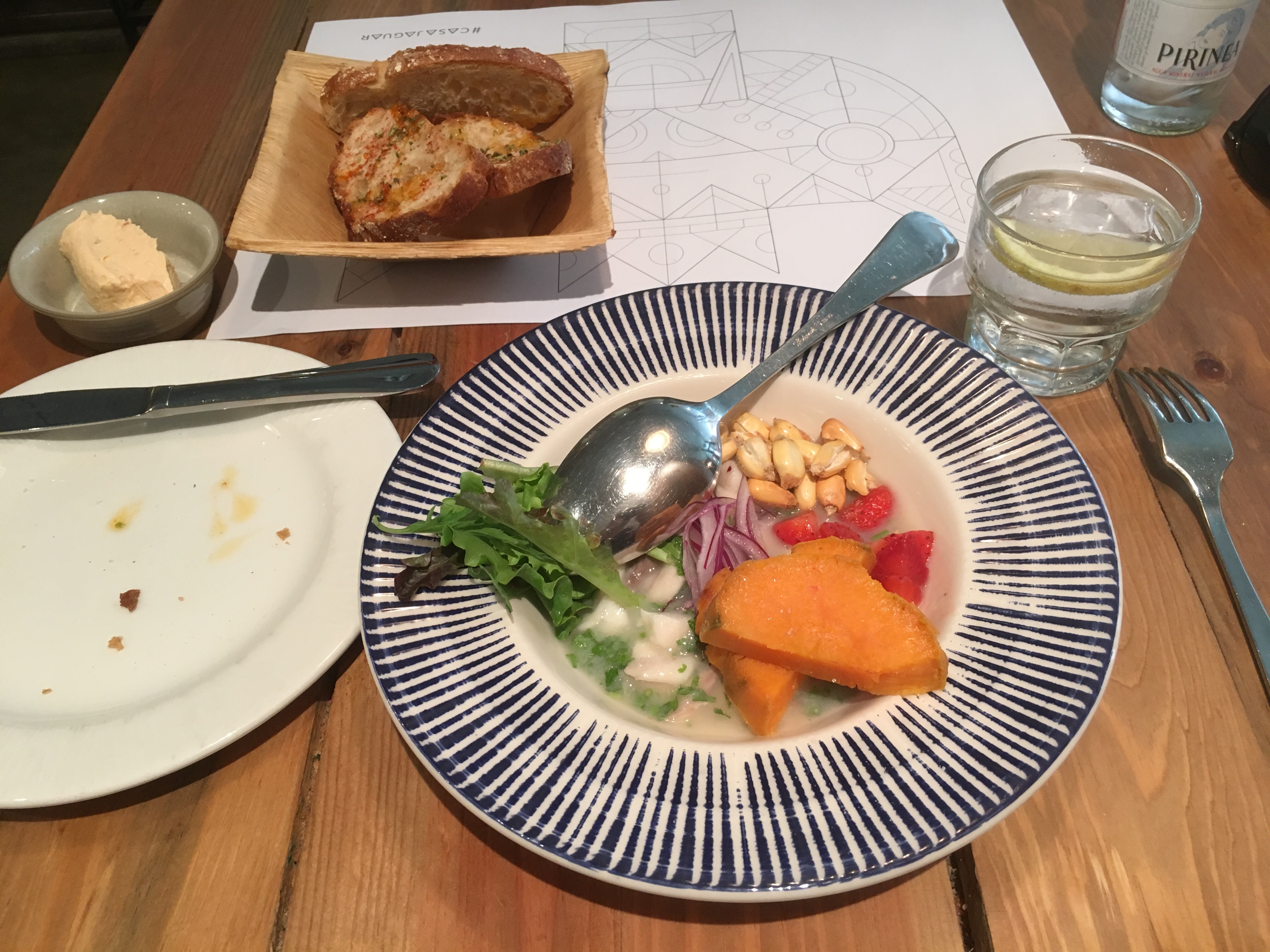 . . . and the ceviche I had for lunch with sea bass, fresh strawberries, mint, sweet potato, and puffed Peruvian corn . . .