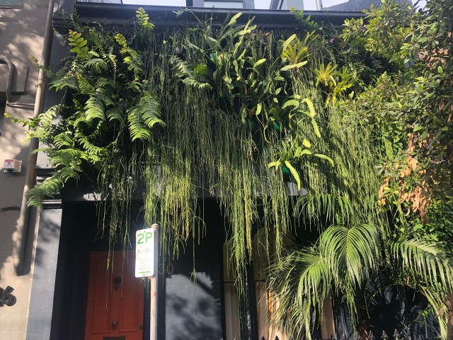 But as far as I’m concerned the house below wins from a container-gardening perspective. Just look at that greenery!! I love the mix of ferns, orchids, and trailing green strands. Once I got up close, I could see that the look was achieved with many hanging planters that had been hooked onto the railings and then allowed to grow large. Such a simple way to achieve a terrific effect.