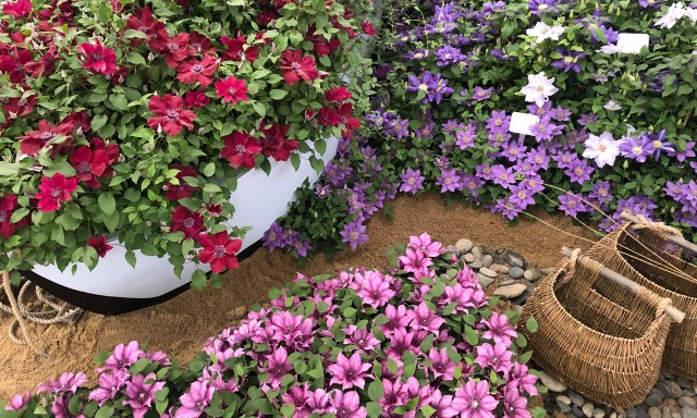 . . . and of course the frothy waves of clematis, which here were grown trailing as ground cover rather than as climbers (or rather, they were grown as trailers but with short dowels that weren’t visible but which added depth by helping the vines climb up off the ground — another idea to try in future) . . .