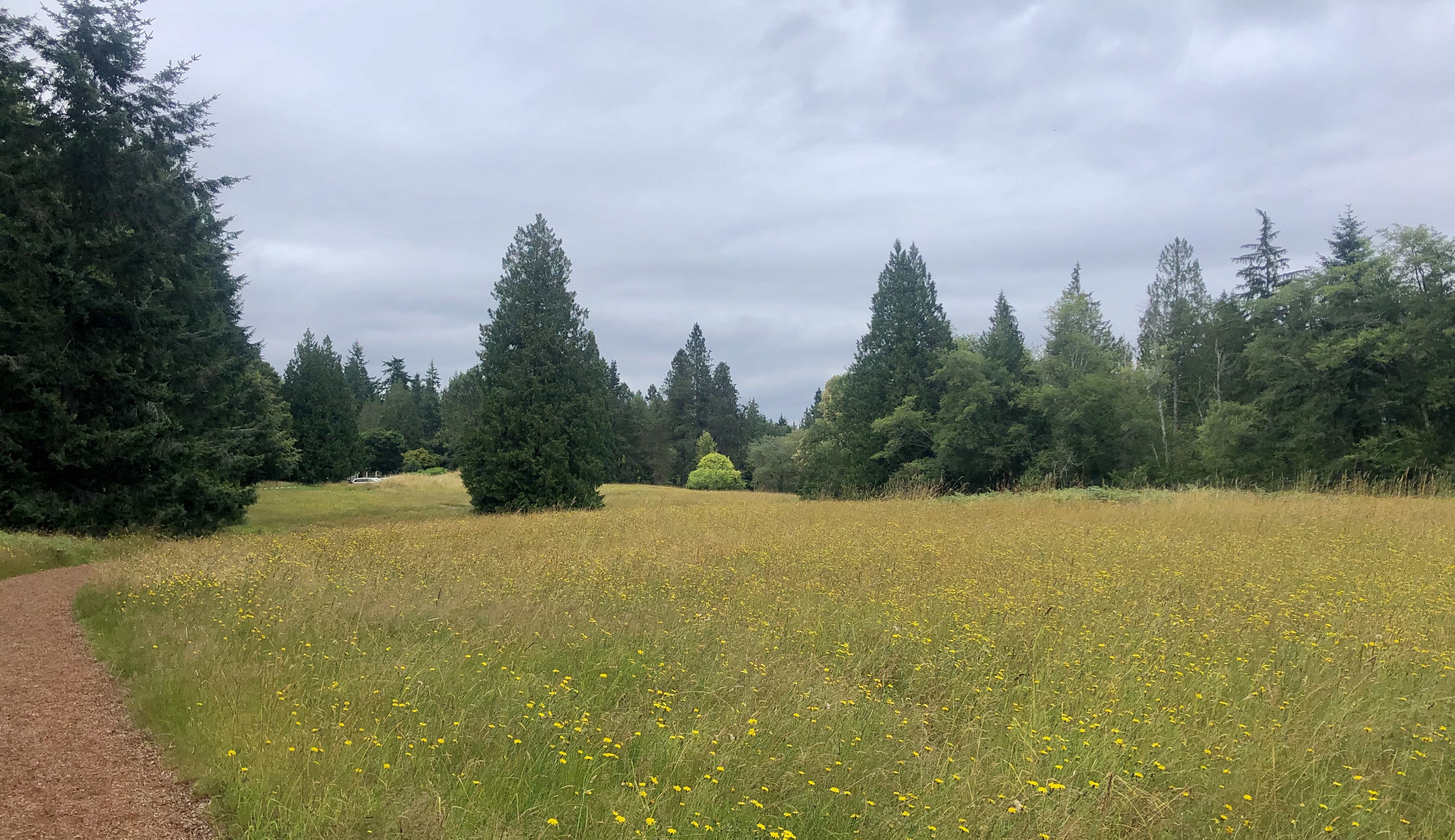 Similar to many of the big estate gardens I’ve been visiting in England, the reserve is a cultivated version of “nature” that showcases the extraordinary natural beauty of the Pacific Northwest. A footpath guides visitors around the property through various zones. First an expansive meadow full of waving grasses and wildflowers . . .