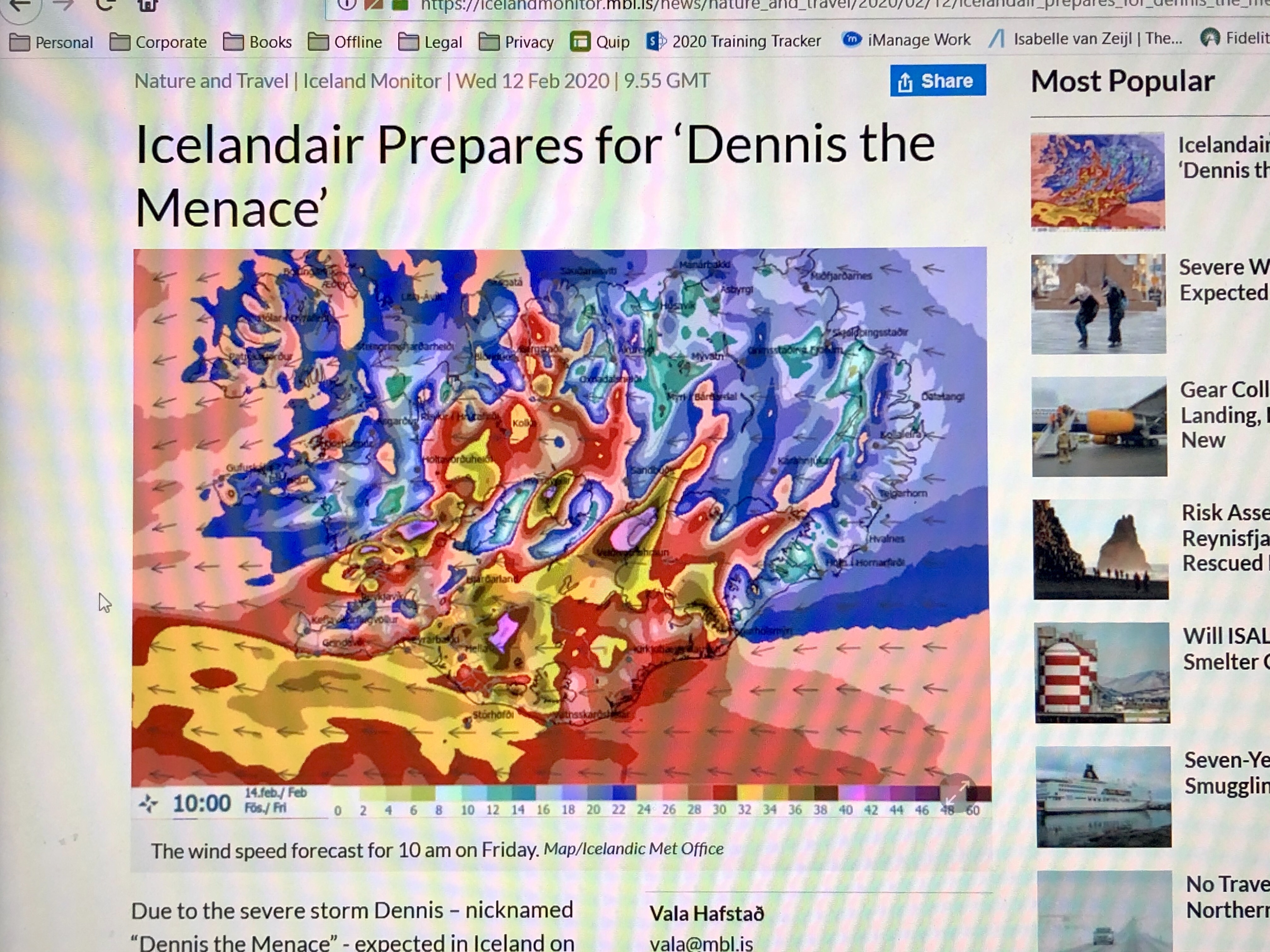 And lo, our flights to Iceland were no more. Apparently storm Dennis (aka “the Menace”) is about to sock Reykjavík with a massive winter storm this weekend, meaning that all flights from Friday through Sunday are canceled.