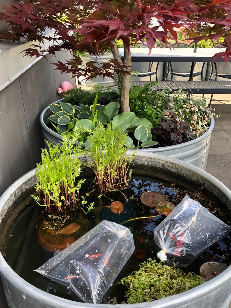 . . . then off to the garden center to see if I couldn’t finish my pond. As luck would have it, I not only did I find some shade-tolerant water celery, plus some fairy moss and duckweed (which may or may not tolerate shade—we’ll see!) to go with my water lily, but on the way home I also found a petshop with a fresh shipment of pond goldfish! So we’re officially in business on the water garden front . . .