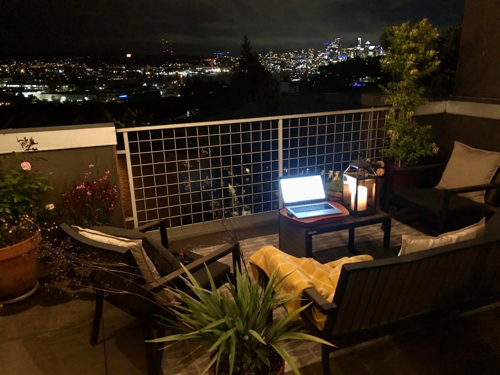 I hope you’ll excuse another “working from home” post. It’s just that if you have to work late on a clear summer night in Seattle, the best way to do it is wrapped in a blanket with a view of the city skyline and a patio heater, surrounded by honeysuckle, gardenias, and roses all in full bloom.