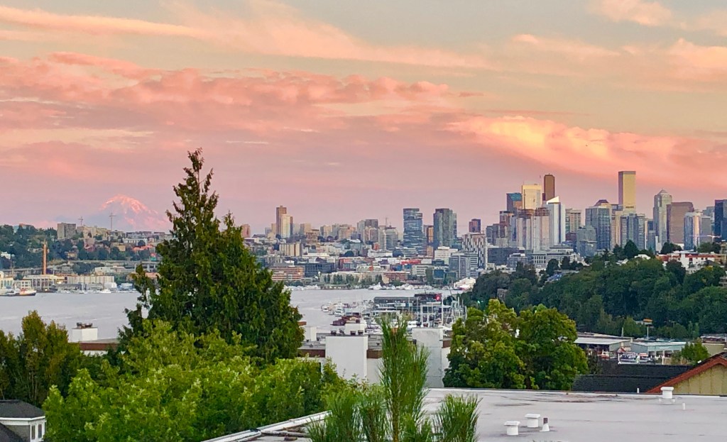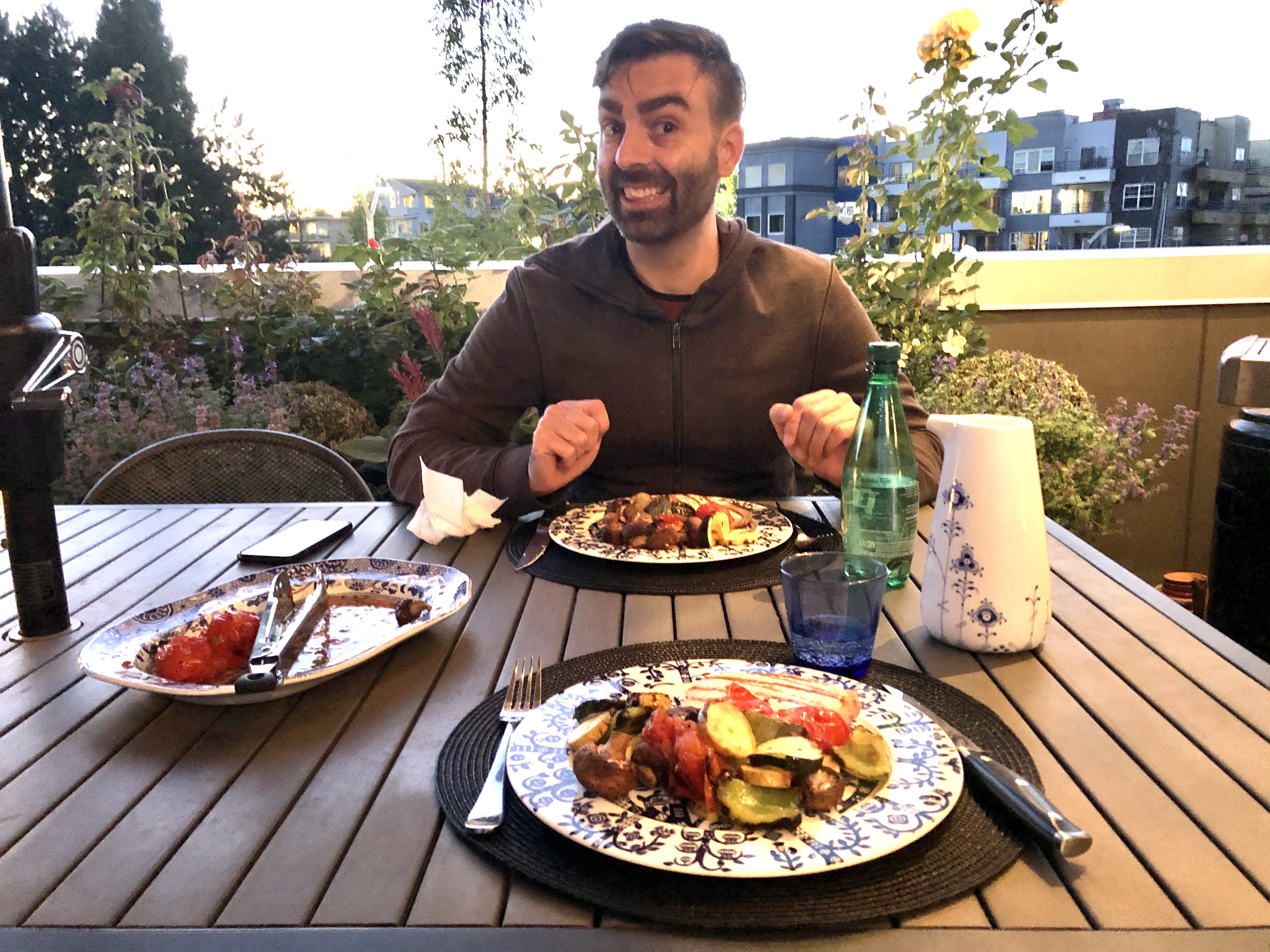After that he went on a bike ride until I was done with work, at which point we discovered that all the good restaurants were closed due to its being Monday—so we made do by grilling on the roof with a beautiful sunset in the background.