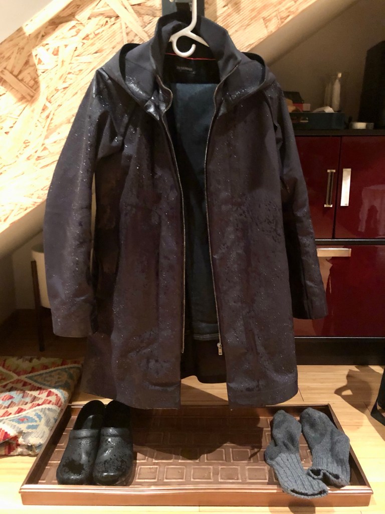 By the time I got back I was soaked and had to hang my coat and clothes over a tray to catch the runoff.