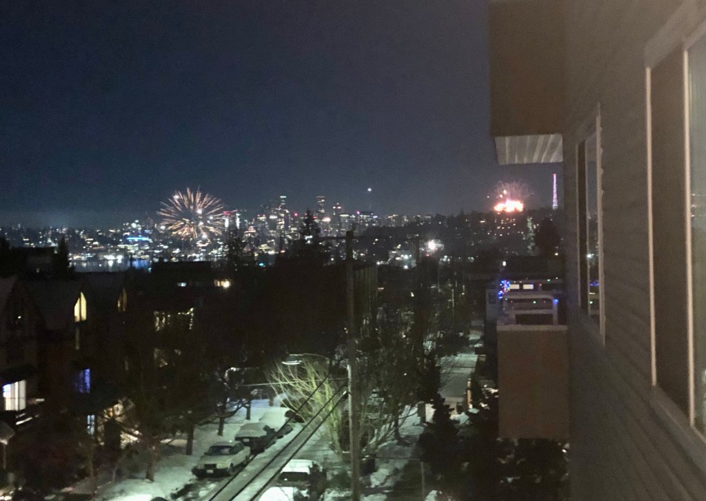 We made gnocchi, watched four episodes of Lost in Space, and FaceTimed family and friends in the Mountain time zone when their midnight arrived. Then we braved the icy streets to Justin’s place so we could watch the Seattle fireworks shot from the top of the Space Needle. And now to bed to get our beauty rest for 2022.