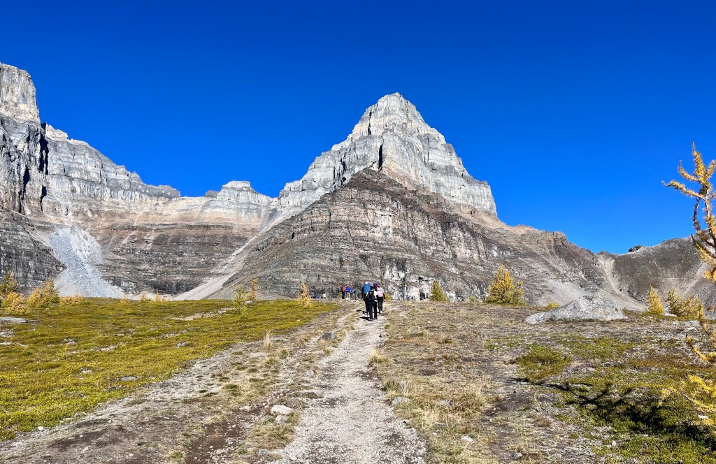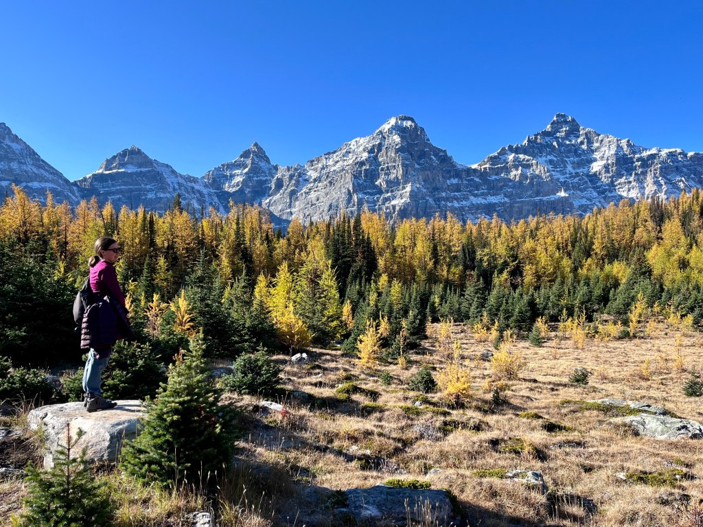 We ultimately rode 3 shuttles, hiked 12 miles, saw 5 lakes, and ate 2 pains au chocolat, before checking into our cozy room at The Post Hotel in Lake Louise. Also? We couldn’t have timed our visit to Larch Valley better if we had tried (we didn’t try). The whole place was peak color and glorious.